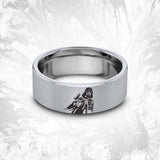 This is an awesome Darth Vader designed wedding band on our Silver Tungsten Carbide Ring. Darth Vader's infamous pose is custom engraved and is perfect for Star Wars fans!