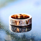 This is a beautiful Disney Inspired ring that shows a very unique and one of kind filigree design meshed with Mickey Mouse that is custom engraved around the entire ring. A ring that you won't find anywhere else :) the design is engraved on our Rose Gold Tungsten Ring but is also available in multiple colors! Perfect for that special someone/Disney lover.