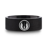 This is an awesome custom engraved Star Wars Rebel Alliance design on our Brushed Black Tungsten Carbide ring. The ring is simplistic in design but beautifully eye piercing and recognized by true Star Wars fans!