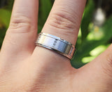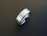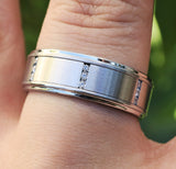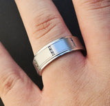 This is an highly sought after modern design that we only have limited quantity at the moment! 3 white diamonds (CZ) set into 6 channels going around the entire ring evenly. The gems go across the width of the band, providing a geometrically beautiful appearance to the band. The center is made of a mixture of silver/steel (to prevent tarnish) and the gems are held in place using tension, no prongs are used, which further give the ring a clean modern look.