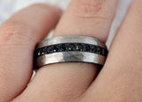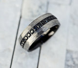 Men's Black Diamond Hammered Finish Tungsten Ring, Silver Domed Ring, Black Sapphire Ring Band, Black Diamond Ring, Tungsten Carbide Ring