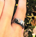 We are loving this 100% custom made Jack and Sally design. This custom ring not only comes with a design of the two characters and their surroundings but also their infamous saying within the inner part of the ring. A romantic and unique piece for someone special.