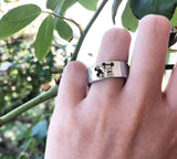 This is a beautiful Disney Inspired ring that shows the infamous Mickey and Minnie being smitten with one another. Showcase your love for Disney and your loved one all together with this beautifully custom engraved ring.