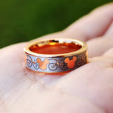 This is a beautiful Disney Inspired ring that shows a very unique and one of kind filigree design meshed with Mickey Mouse that is custom engraved around the entire ring. A ring that you won't find anywhere else :) the design is engraved on our Rose Gold Tungsten Ring but is also available in multiple colors! Perfect for that special someone/Disney lover.