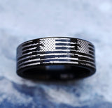 This is a wonderful American Flag Wedding Band on our Black Tungsten Carbide Ring. The design is fully wrapped around the entire ring.