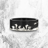 This is an amazing US Army Battle Scene design on our Black Tungsten Carbide Ring. A bold yet simplistic logo to honor those who have served. This is not a wrapped around design but can be if requested.