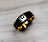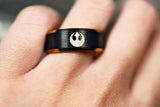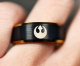 This is our beautiful Star Wars Inspired Rebel Alliance custom engraved design on our Gold Beveled Edges and Black Center wedding band.