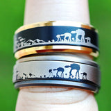 This is our Star Wars Battle Scene Spinner Ring! The design moves freely around the ring as the center part of the ring is able to spin when moved. The black and gold edges spinner ing style is the default for this listing (top ring), but can be requested in silver matte (pictured) or rose gold edges with black center, or all black. Send us a message if you'd like a different color way for the spinner ring style.