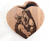Check out our beautiful one of a kind Cloud and Tifa Inspired ring box with our infamous duo. All of our boxes are made with 100% real Black Walnut wood and have a soft black velvet inner lining. All wood boxes are unique in grain pattern and can vary in color/appearance from the photo. All engravings are fresh and made to order so there might be a slight engraved wood smell that fades with time.