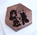 Check out our beautiful one of a kind Cloud and Tifa Inspired ring box with our infamous duo. All of our boxes are made with 100% real Black Walnut wood and have a soft black velvet inner lining. All wood boxes are unique in grain pattern and can vary in color/appearance from the photo. All engravings are fresh and made to order so there might be a slight engraved wood smell that fades with time.
