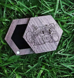 All of our boxes are made with 100% real Black Walnut wood and have a soft black velvet inner lining. All wood boxes are unique in grain pattern and can vary in color/appearance from the photo. All engravings are fresh and made to order so there might be a slight engraved wood smell that fades with time.