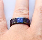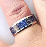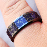 This is a beautiful blue Lapis Lazuli inlaid wedding ring. This ring has real Lapis Lazuli stone inlaid into the center channel of the ring. Lapis Lazuli is a beautiful blue stone with gold flecks that naturally form throughout the stone. Every piece of stone in all of our rings are unique and one of a kind. We offer lapis lazuli inlay in two color bands: silver (tungsten carbide) and black (black ceramic).