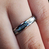 This is our beautiful Abalone Shell Inlay Wedding Band in 4mm ring width. A truly simplistic yet beautiful piece of jewelry for you or your significant other.