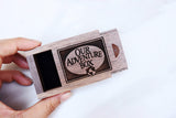 This is an adorable Up Movie inspired ring box with the adorable saying "Our Adventure Box" on the front. All of our boxes are made with 100% real Black Walnut wood and have a soft black velvet inner lining. All wood boxes are unique in grain pattern and can vary in color/appearance from the photo. All engravings are fresh and made to order so there might be a slight engraved wood smell that fades with time.