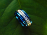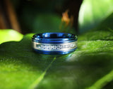 Blue Polished Edge Tungsten Ring, Channel Diamond Wedding Band, Diamond with Blue Trim Wedding Ring, Men's Blue Wedding Band - 8mm
