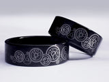 This is a Dr. Who inspired ring set where one ring has the Gallifreyan pattern on it. The pattern itself says "You and Me, Time and Space, Watch Us Run"