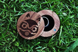 Check out our beautiful Princess Mononoke Inspired ring box. All of our boxes are made with 100% real Black Walnut wood and have a soft black velvet inner lining. All wood boxes are unique in grain pattern and can vary in color/appearance from the photo. All engravings are fresh and made to order so there might be a slight engraved wood smell that fades with time.