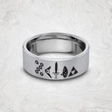 This is our beautiful custom made Zelda design on our Silver Tungsten Carbide wedding band. A very unique and custom design for true Legend of Zelda fans. The symbols in our custom engraving replicate the name Zelda! Perfect gift for real die-hard fans.
