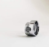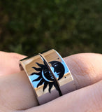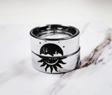 This is a beautiful Sun and Moon Ring set that is fully customizable as well! One ring has the sun design while the other has the matching moon design on the other. Please advise which ring you'd like to have for each design during your purchase.