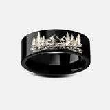 This is a beautiful scenic mountain river scene design on our Black Tungsten Carbide Wedding Band. This is not a wrapped design but can be if requested.