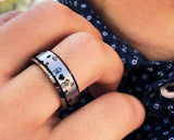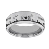 This is our custom engraved Super Mario design that has Super mario, Super Mario Princess and Yoshi on the entire design. This is a fully wrapped design that covers the entire ring. This ring style is our Brushed Silver Tungsten Carbide Ring with Beveled Edges.