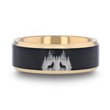 This is a beautiful Howling Wolves design on our Gold Plated Tungsten Polished Polished Beveled Ring with Brushed Black Center. Our engraved design conveys two wolves howling at the moon freely together in nature.