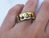 This is a beautiful scenic mountain design on our Gold Plated Tungsten Carbide Wedding Band. This is not a wrapped design but can be if requested.