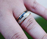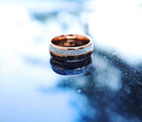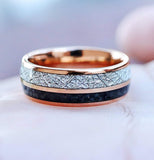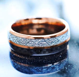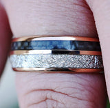 This is our beautiful Rose Gold Domed Tungsten Imitation Meteorite Inlay ring that is NOT real meteorite. Imitation meteorite is a very well known material that is widely used in the jewelry industry. This band is absolutely gorgeous with a perfect balance when paired with black carbon fiber inlay. The ring itself has a comfort fit feel which is contoured to fit comfortably. A one of a kind wedding ring and one of our personal favorites! The inside of the ring is 100% engravable, allowing you to add inner text engravings as you wish :)