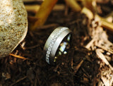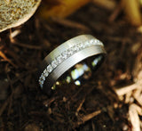 This stunning wedding band, is beautifully handcrafted and made. The entire ring is cover in white diamonds across the center with a domed brushed finish. The ring itself is domed and has a comfort fit feel. This ring will stand out with it's classic and sleek charm. Not only are the gems bright and clear, but the ring itself is spotless to look at. 8mm ring width, a perfect sized wedding band for you or your significant other.