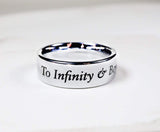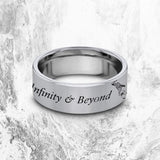 This is a beautiful and simplistic Toy Story custom engraved design on our Silver Tungsten Carbide ring! The infamous saying, "To Infinity & Beyond" is wrapped around the front of the ring along with Buzz himself flying through! We can alter and change anything you'd like of the design, just send us a message :)