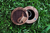 All of our boxes are made with 100% real Black Walnut wood and have a soft black velvet inner lining. All wood boxes are unique in grain pattern and can vary in color/appearance from the photo. All engravings are fresh and made to order so there might be a slight engraved wood smell that fades with time.