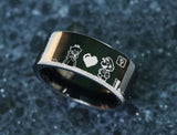 This is our custom engraved Super Mario design that has Super mario, Super Mario Princess and Yoshi on the entire design. This is a fully wrapped design that covers the entire ring. This ring style is our Black Tungsten Carbide Ring.